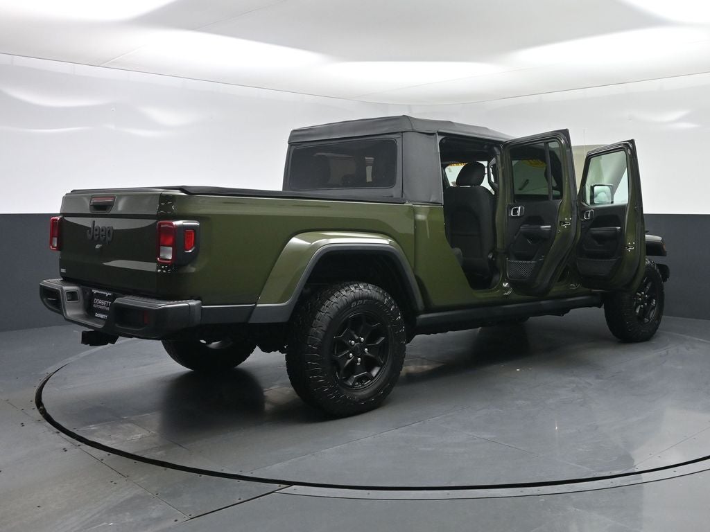 2021 Jeep Gladiator Willys — rugged capability meets everyday comfort in Terre Haute, IN. This eye-catching Willys edition boasts a strong 3.6L V6 gasoline engine paired with proven 4WD, giving you confident off-road performance and smooth highway cruising. Built for outdoor adventures and daily commutes, this Jeep Gladiator features modern tech like Apple CarPlay and Android Auto for seamless smartphone integration, Satellite Radio for long drives, and Remote Start for comfort in any season. Safety and convenience are covered with a Back-Up Camera for easier parking and trailhead maneuvers, plus durable Willys-tuned suspension, heavy-duty tires, and unique styling that sets it apart from standard midsize pickups. The versatile bed and removable top let you switch from cargo hauler to open-air cruiser in minutes, while the Willys package adds rugged trim and functional upgrades for true off-road readiness. Located in Terre Haute, IN, this 2021 Jeep Gladiator Willys is attractively priced and delivers exceptional value — it's the best price you'll find for this combination of features, capability, and condition. Whether you're planning weekend overland trips, towing gear, or navigating city streets, this Jeep Gladiator provides the utility and tech you want with iconic Jeep character. Contact us today to arrange a test drive and see why this Willys Jeep Gladiator is the ideal mix of adventure and everyday usability at the best price in Terre Haute.