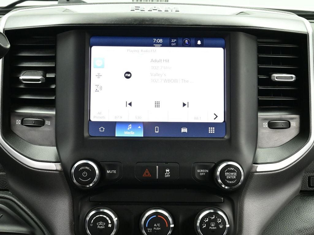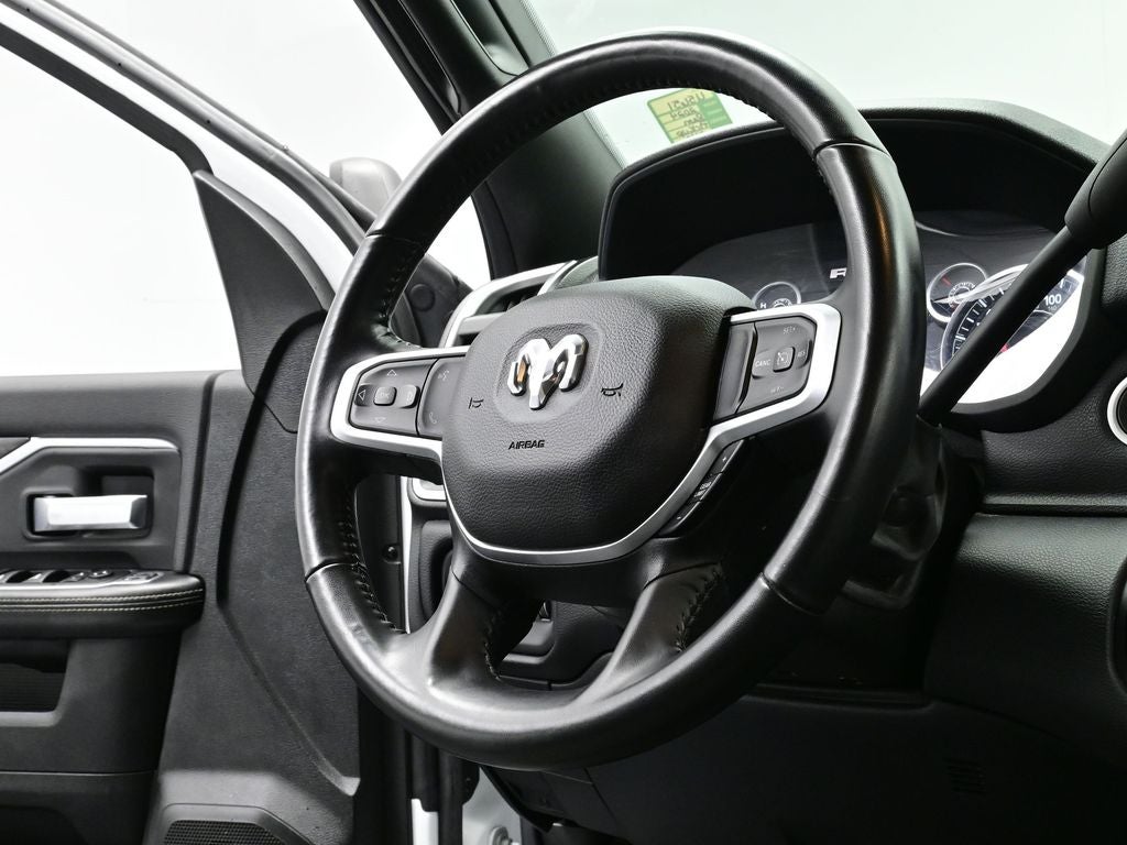 Quick Order Package 2HZ Big Horn. Level 1 Equipment Group: Google Android Auto; SiriusXM Radio Service; Bluetooth® Handsfree Phone and Audio; Integrated Center Stack Radio; For Details. Visit DriveUconnect.com; For More Info. Call 800-643-2112; Leather Wrapped Steering Wheel; Rear Dome with On/off Switch Lamp; Front Fog Lamps; Integrated Voice Command with Bluetooth®; Connectivity - US/Canada; Premium Cloth 40/20/40 Bench Seat; Glove Box Lamp; Auto Power-Folding Mirrors; Footwell Courtesy Lamp; 4G LTE Wi-Fi Hot Spot; GPS Antenna Input; Exterior Mirrors with Heating Element; Global Telematics Box Module; Mirror Running Lights; Uconnect 5 W Radio with 8.4" Display; 8.4" Touchscreen Display; Foam Bottle Insert (door Trim Panel); Black Exterior Mirrors; 18" X 8.0" Polished Aluminum Wheels; Apple CarPlay; Big Horn Instrument Panel Badge; Power Adjustable Convex Aux Mirrors; Forward and Reverse Utility Lights; Locking Lower Glove Box; Selectable Tire Fill Alert; SiriusXM Satellite Radio; Power Heated Fold Telescope Mirrors; Exterior Mirrors with Supplemental Signals; Steering Wheel Mounted Audio Controls; Exterior Mirrors Courtesy Lamps; Dual Glove Boxes; Center Hub; Power Adjust Mirrors; 2nd Row in Floor Storage Bins; Power Telescoping Mirrors. Quick Order Package 2GZ Big Horn. Premium Cloth 40/20/40 Bench Seat. Chrome Flat Cab-Length Side Steps. Front Fog Lamps. Tow Hooks. **Equipment listed is based on original vehicle build and subject to change. Please confirm the accuracy of the included equipment by calling the dealer prior to purchase.**